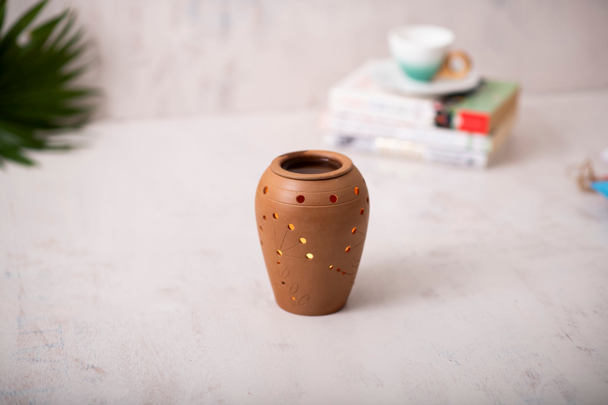The dragonfly, often seen as a symbol of transformation, light, and resilience, inspires this diffuser. Its delicate perforations mimic the intricate flight paths of dragonflies, allowing light to escape and create a calming ambiance. Made from sustainable terracotta, this diffuser connects you to nature, while its handcrafted floral and dot design celebrates the elegance of simplicity. The Dragonfly Diffuser is not just a functional piece—it’s a work of art that represents change, grace, and balance, making it ideal for all occasions.