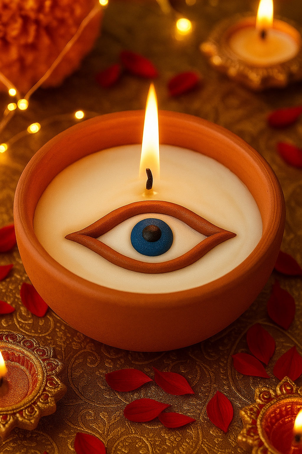Bring home light, beauty, and protection with our handcrafted Evil Eye Candle. Made in a terracotta bowl, this candle carries the ancient symbol of the “Nazar Suraksha” – believed to ward off negativity and attract positivity. The calming flame combined with the powerful evil eye design makes it perfect for festive décor, meditation corners, or thoughtful gifting. Each candle is eco-friendly, hand-poured with natural wax, and infused with traditional artistry. Illuminate your space with more than light – embrace safety, serenity, and soulful charm. A timeless blend of tradition, energy, and design for your home.
